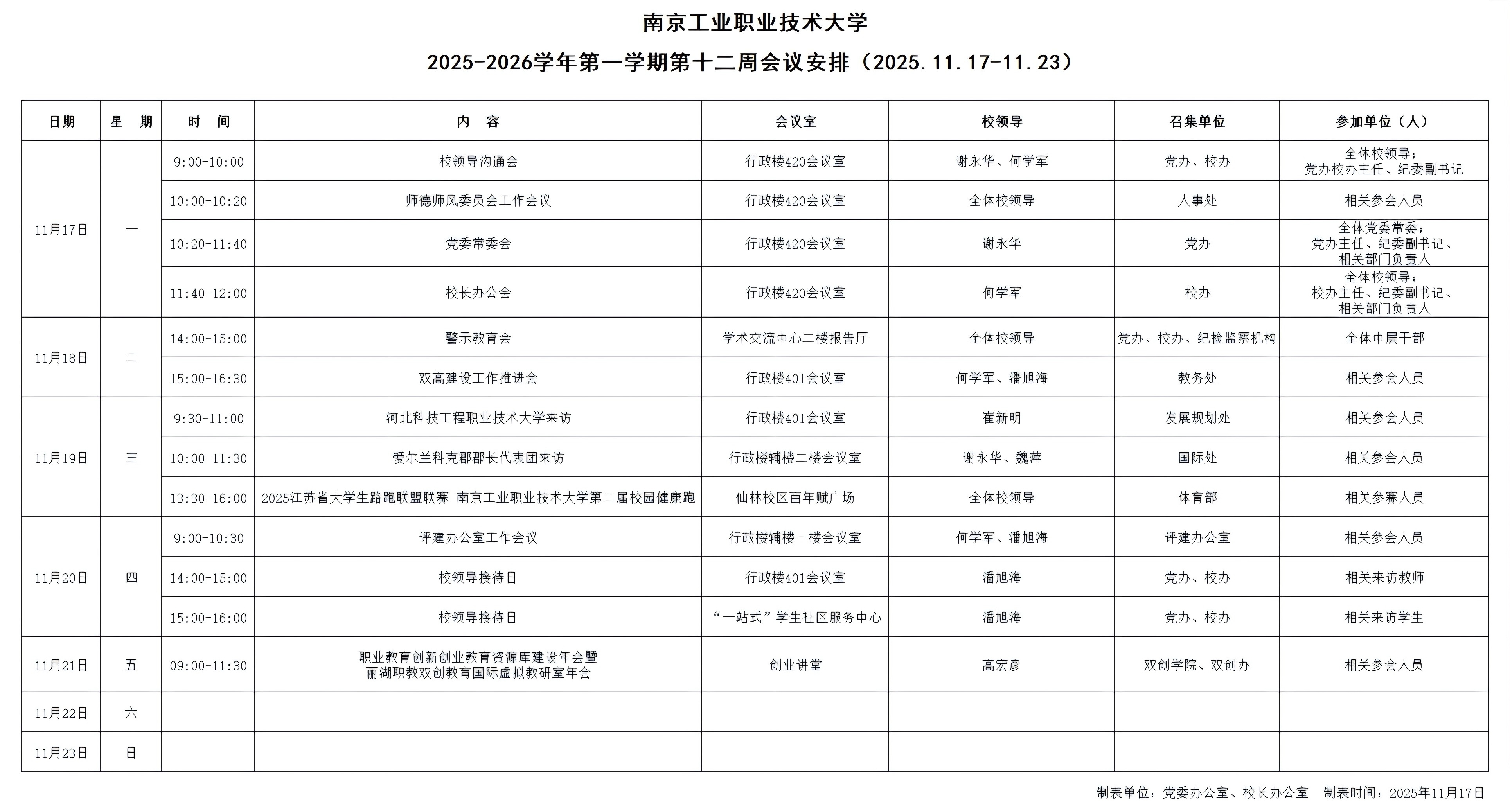2025-2026学年第一学期第十二周会议安排(2025.11.17-11.23)