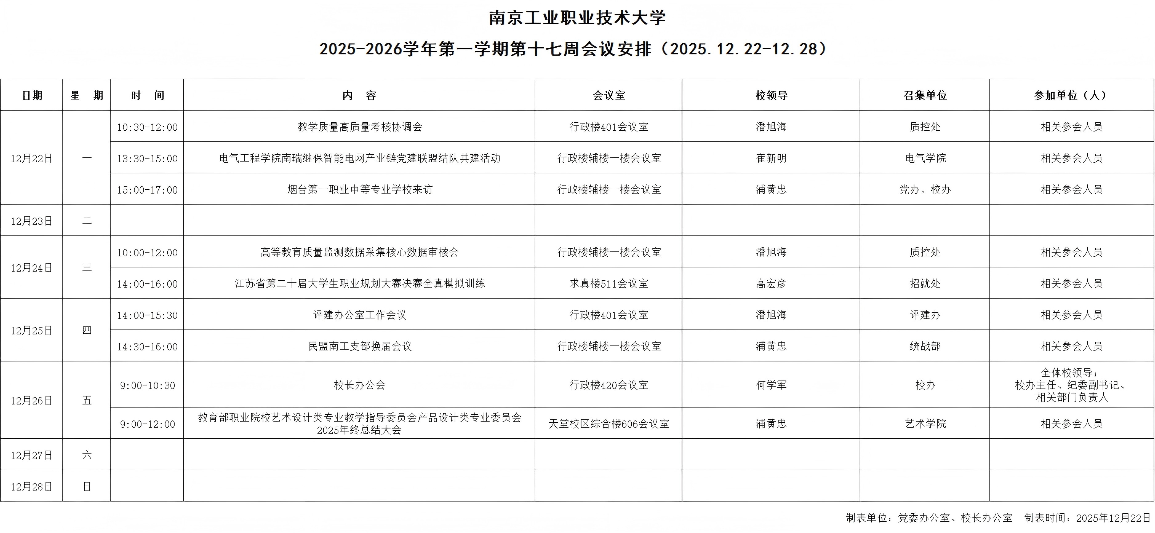2025-2026学年第一学期第十七周会议安排(2025.12.22-12.28)