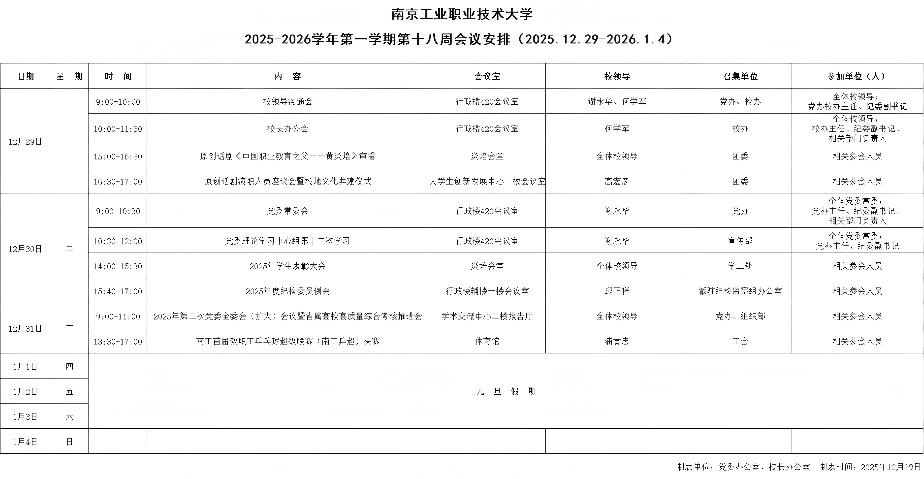 2025-2026学年第一学期第十八周会议安排(2025.12.29-2026.1.4)