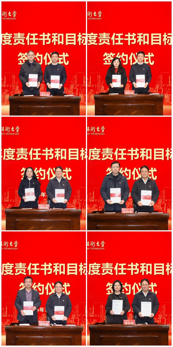 会上,谢永华、何学军分别与学校领导班子成员代表、党组织书记、学院院长、职能部门负责人代表签订《意识形态工作责任书》《安全稳定责任书》《网络安全责任书》《教职工思想政治和师德师风建设工作责任书》和《2026年目标任务书》。