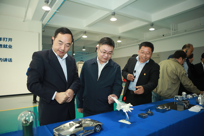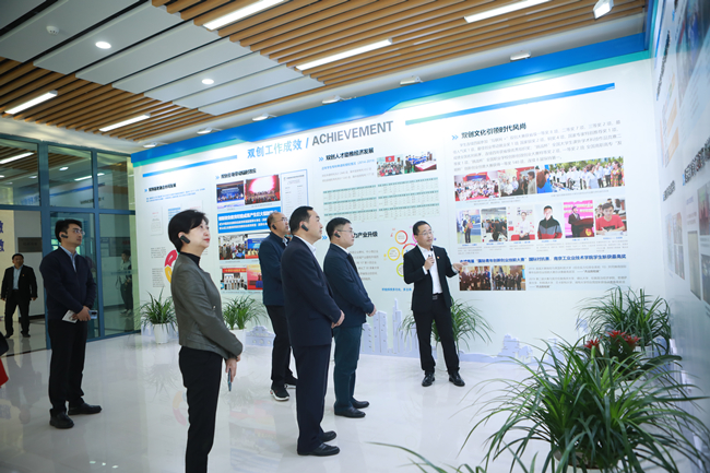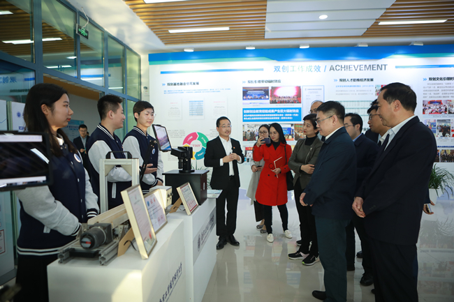 在国家双创示范基地和产教融合基地,调研组参观了学校大学生科技创新作品展,听取了大学生科创社团科创作品的介绍,对我校双创教育体系及学生创新创业成果表示赞许。