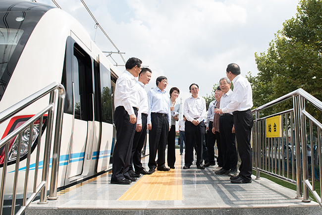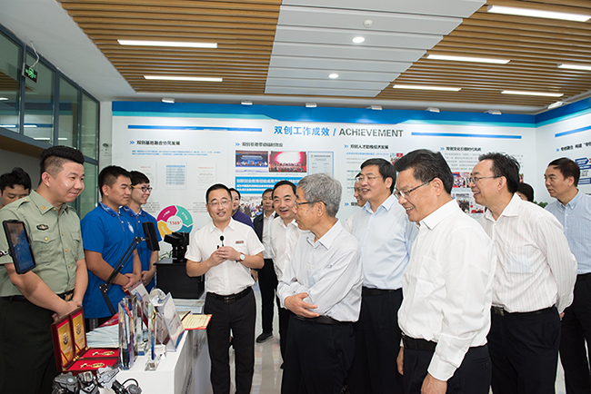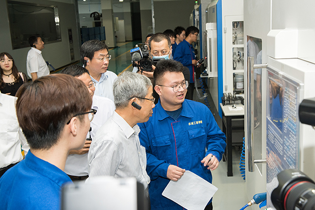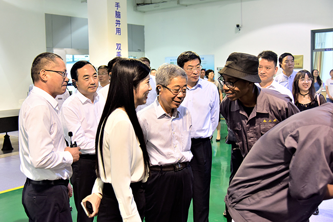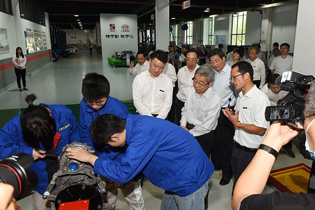 在国家双创示范基地和产教融合基地,陈宝生参观了学校大学生科技创新作品展,与科创达人亲切交谈,认真听取了各项科创作品的介绍,对围绕社会需求和实际问题开展科技创新的学生成果表示赞许。他深入教学实训一线,实地走访产教融合先进制造实训基地,考察了智能制造综合实训中心、先进数控技术实训中心、比亚迪新能源汽车实训中心、航空机电综合实训中心和城轨机电综合实训中心。陈宝生肯定了我校在产教融合方面所做出的努力,并提出,校企合作就是要建立基于技术发展革新的命运共同体。