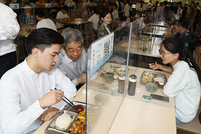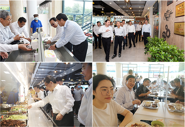 中午,陈宝生一行来到学生食堂,在国庆与中秋佳节即将到来之际,他向师生致以亲切问候,与学生共进午餐。他亲自体验了学生日常排队、点餐、用餐和收残的全过程,关切地询问了学生每天的伙食费用以及能不能吃饱和能不能吃完的问题,并对学生的光盘行动表示赞许。