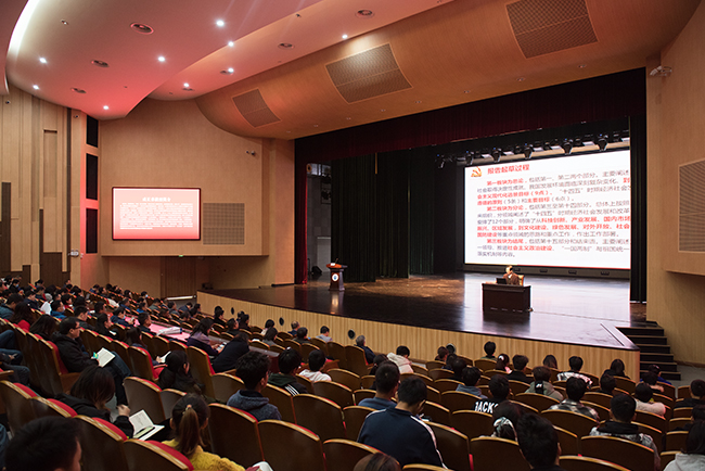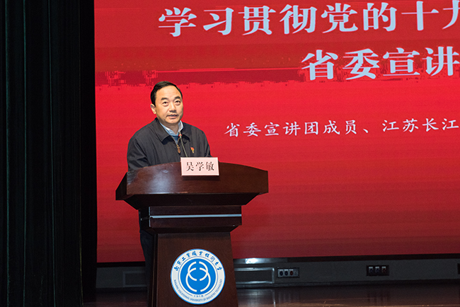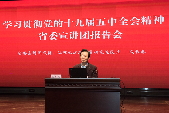 根据省委统一部署,学习贯彻党的十九届五中全会精神江苏省委宣讲团11月23日上午在我校宣讲党的十九届五中全会精神。省委宣讲团成员、江苏长江经济带研究院院长成长春教授作专题宣讲报告。学校领导班子成员,全体中层干部,机关全体教职工,辅导员,思政课教师,学校各级单位宣传员、信息员,学生干部和青年马克思主义者培训班成员代表等350余人在大学生创新发展中心礼堂共同聆听报告。宣讲会由党委书记吴学敏主持。