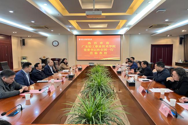3月20日上午,广东轻工职业技术学院党委书记杜安国一行来我校考察调研。党委书记吴学敏,党委常委、副校长霍雄飞以及党委办公室、校长办公室、学工处、国资处等相关部门负责同志在仙林校区行政楼辅楼一楼会议室接待了来宾。