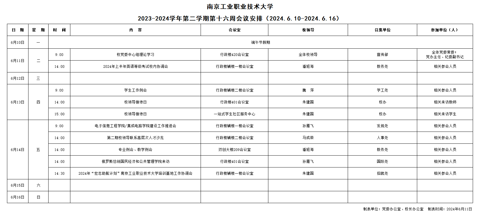 2023-2024学年第二学期第十六周会议安排(2024.6.10-2024.6.16)