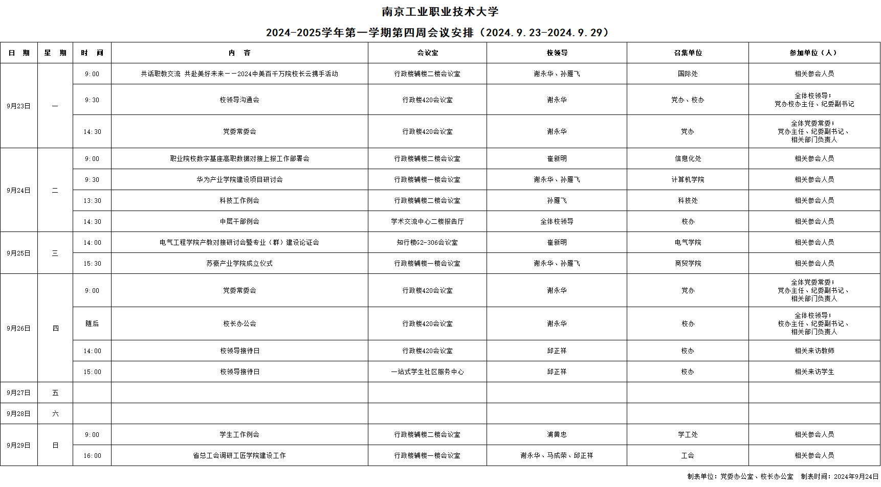 2024-2025学年第一学期第四周会议安排(2024.9.23-2024.9.29)
