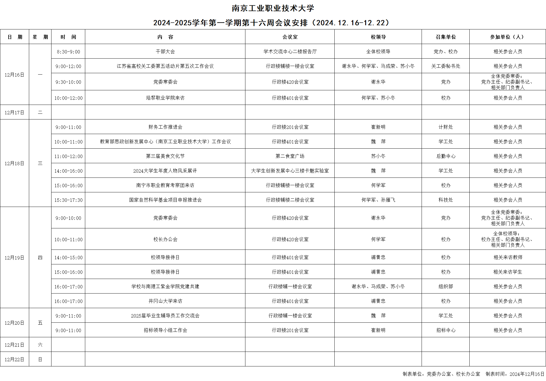 2024-2025学年第一学期第十六周会议安排(2024.12.16-12.22)